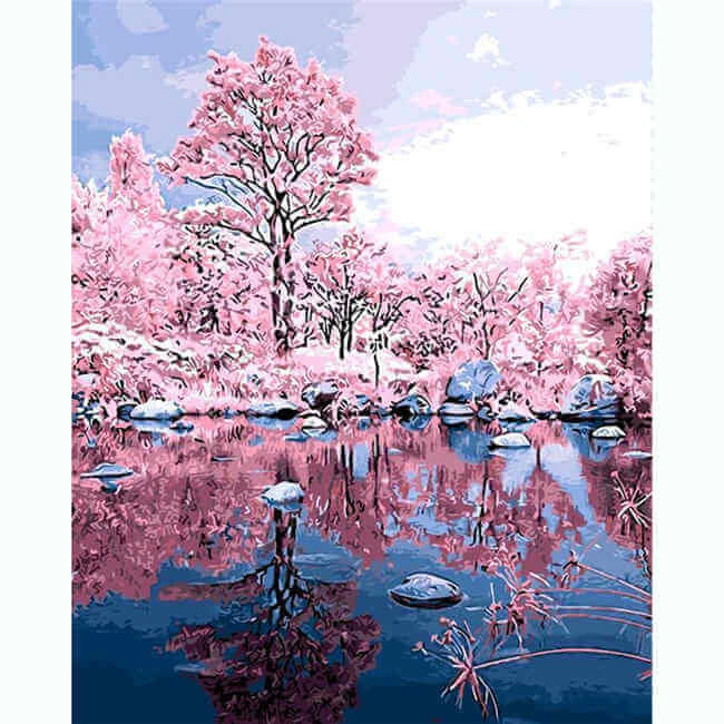 Malen nach Zahlen Bilder Rosa Bäume Spiegelung