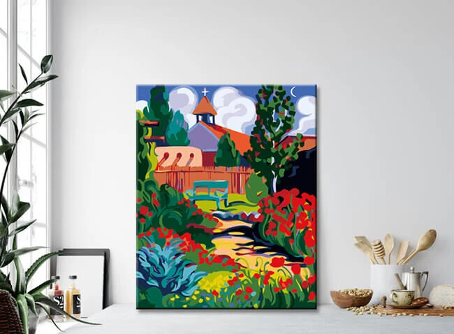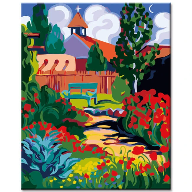 Malen nach Zahlen Dorfidyll mit Kirche und Garten
