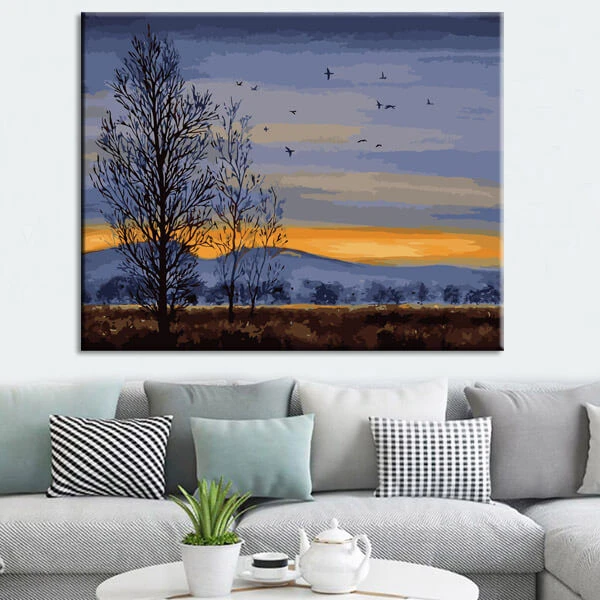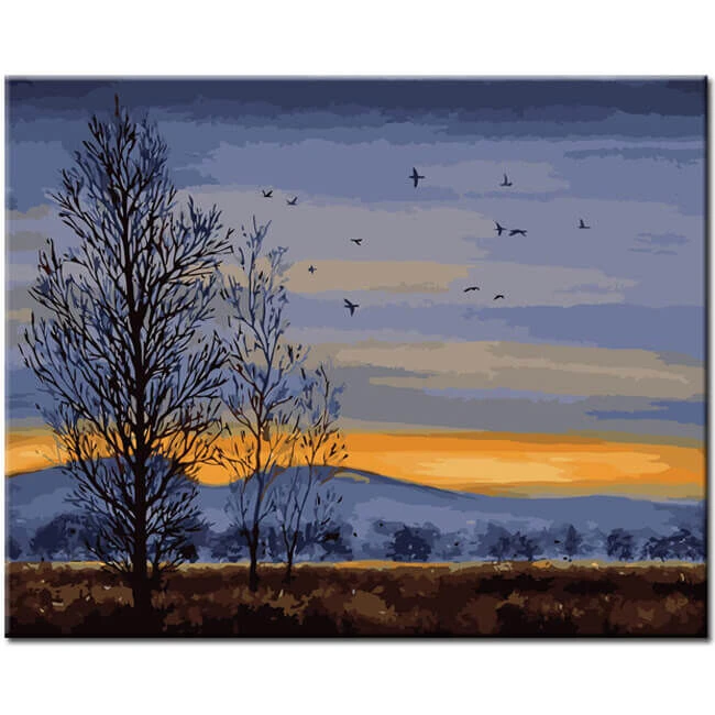 Malen nach Zahlen Kunst Natur Gänse fliegen im Winterhimmel über die kahlen Bäume