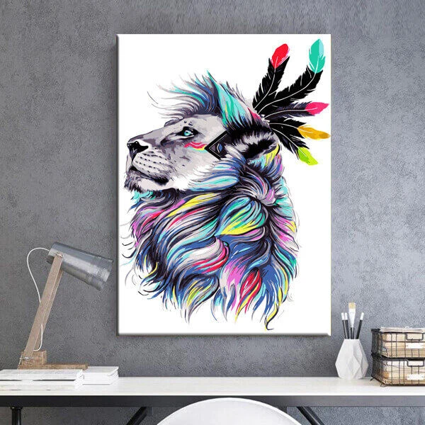 Malen nach Zahlen Kunst Tier Löwe mit bunter Mähne und Federn auf dem Kopf