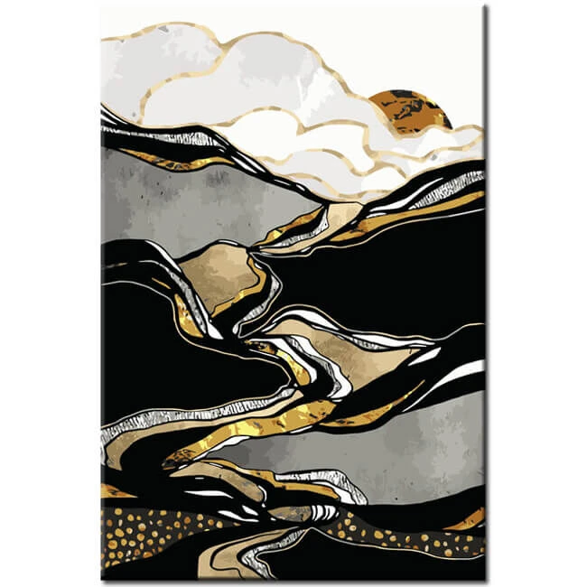 Malen nach Zahlen Kunst Natur goldene Sonne hinter weißem Berg mit silber-goldenen Fluß