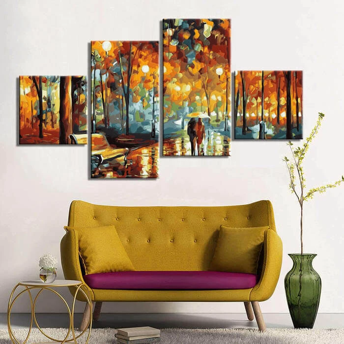 Malen nach Zahlen Kunst Natur Herbstbild mit Pärchen unterm Schirm und Bank 4-teilig
