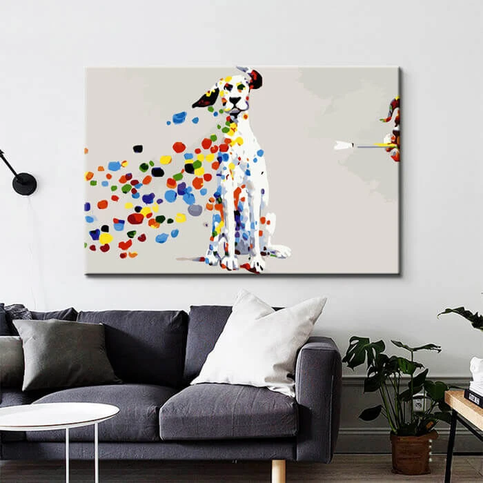 Malen nach Zahlen Kunst Sitzender Hund verliert bunte Punkte