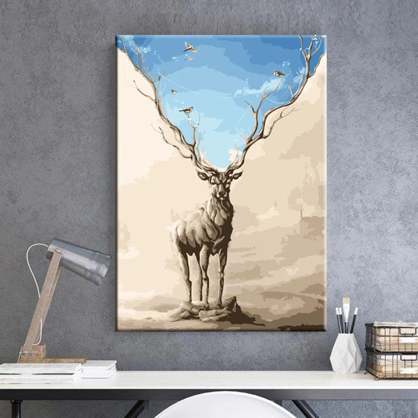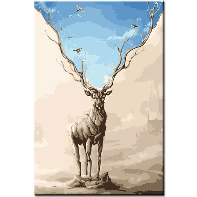 Malen nach Zahlen Kunst Tier Elch mit Geweih auf dem Vögel sitzen