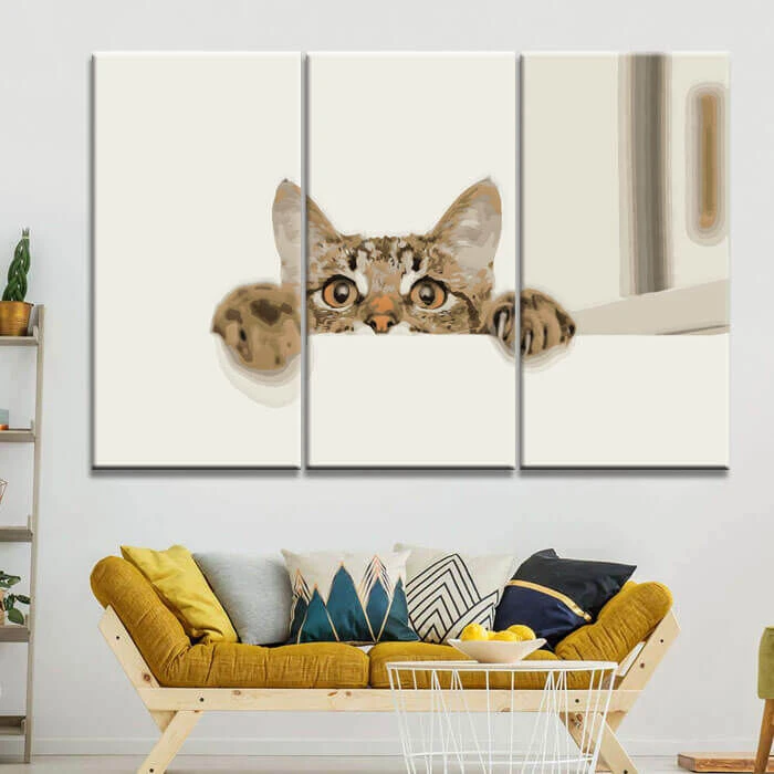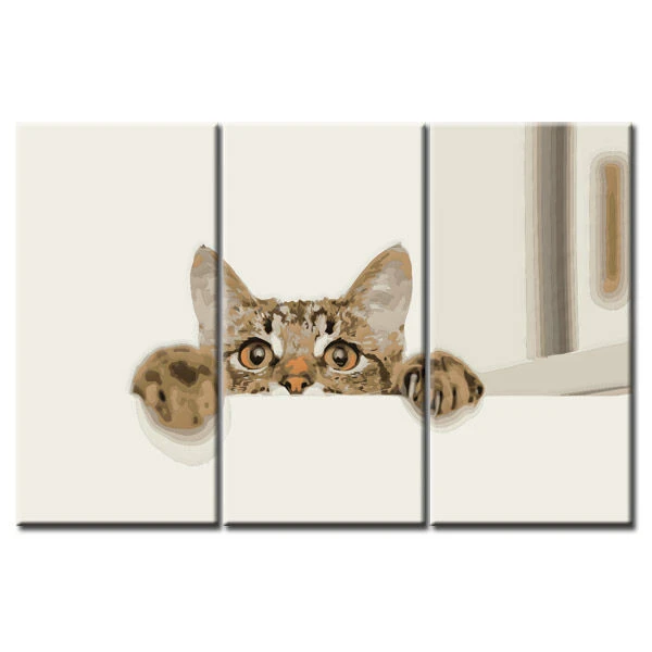 Malen nach Zahlen Kunst Tier Katze hängt mit ihren Pfoten an einer Mauer und guckt 3-teilig