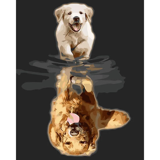 Malen nach Zahlen Kunst Tier kleiner Hundewelpe spiegelt sich in der Pfütze