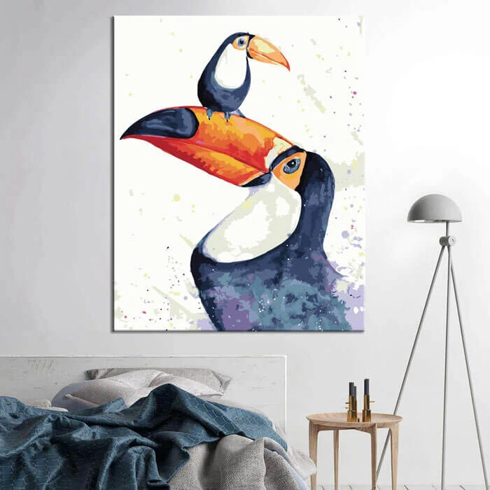 Malen nach Zahlen Kunst Tier Tukan hat Tukanbaby auf dem Schnabel