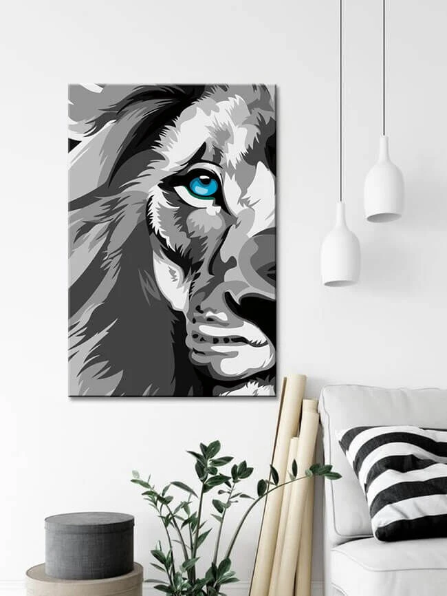 Malen nach Zahlen Löwe schwarz-weiss mit blauen Augen