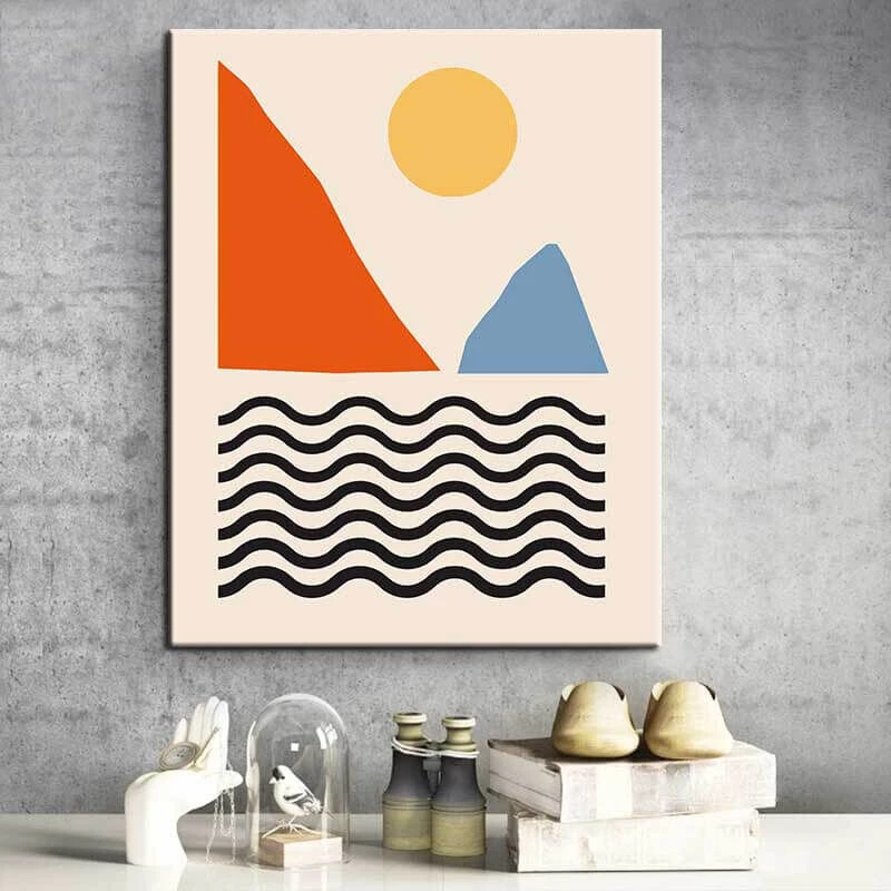 Malen nach Zahlen Kunst Minimalismus gelbe Sonne, Wellen und bunte Berge