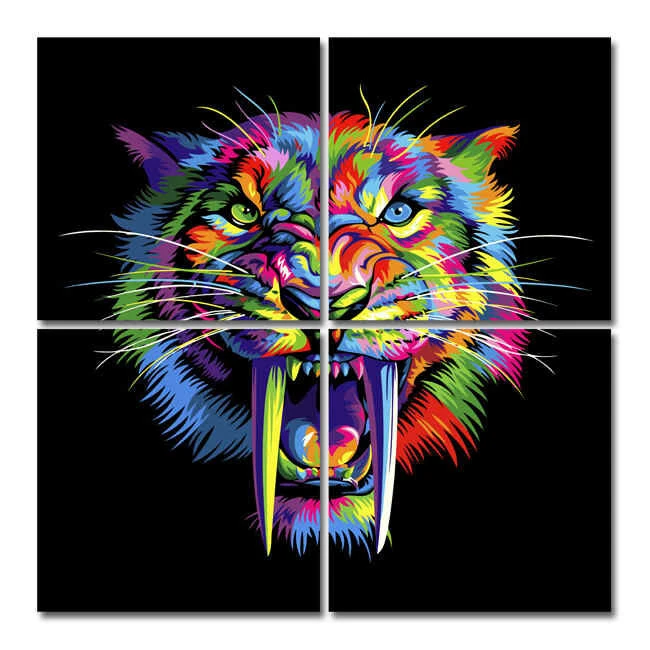 Malen nach Zahlen Tiger in Regenbogenfarben Tierkunst – 4-teilig (Triptychon)